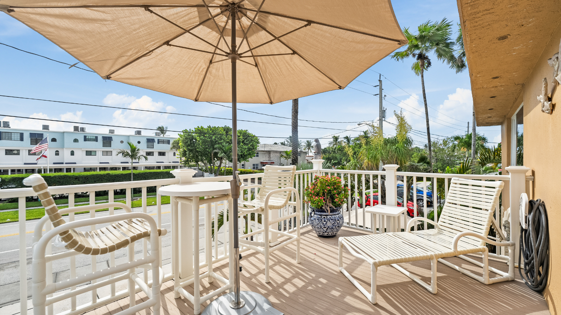 - FRONT BALCONY SET UP WITH UMBRELLA TABLE, TWO HIGH CHAIRS, AND TWO LOUNGES